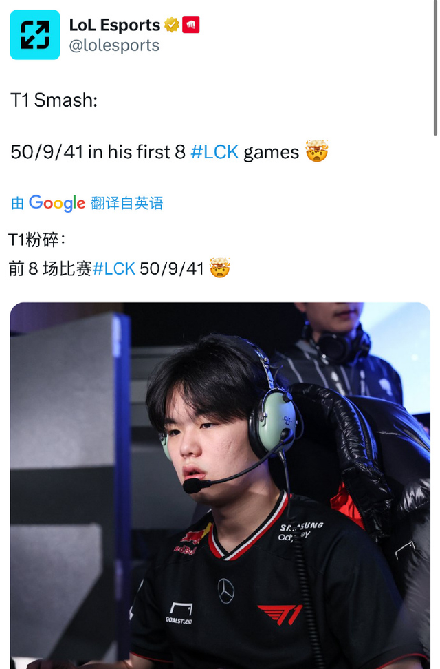 在LCK杯小组赛的比赛结束过后,Smash代表T1首发出战了三场比赛,总共8个小局的比赛斩获了50/9/41的超模数据。对于一名刚登陆LCK的新人选手而言,这个数据完全可以用“超模”来形容,因此在韩网不少观众也给这位出产自T1青训的小AD极高的评价。